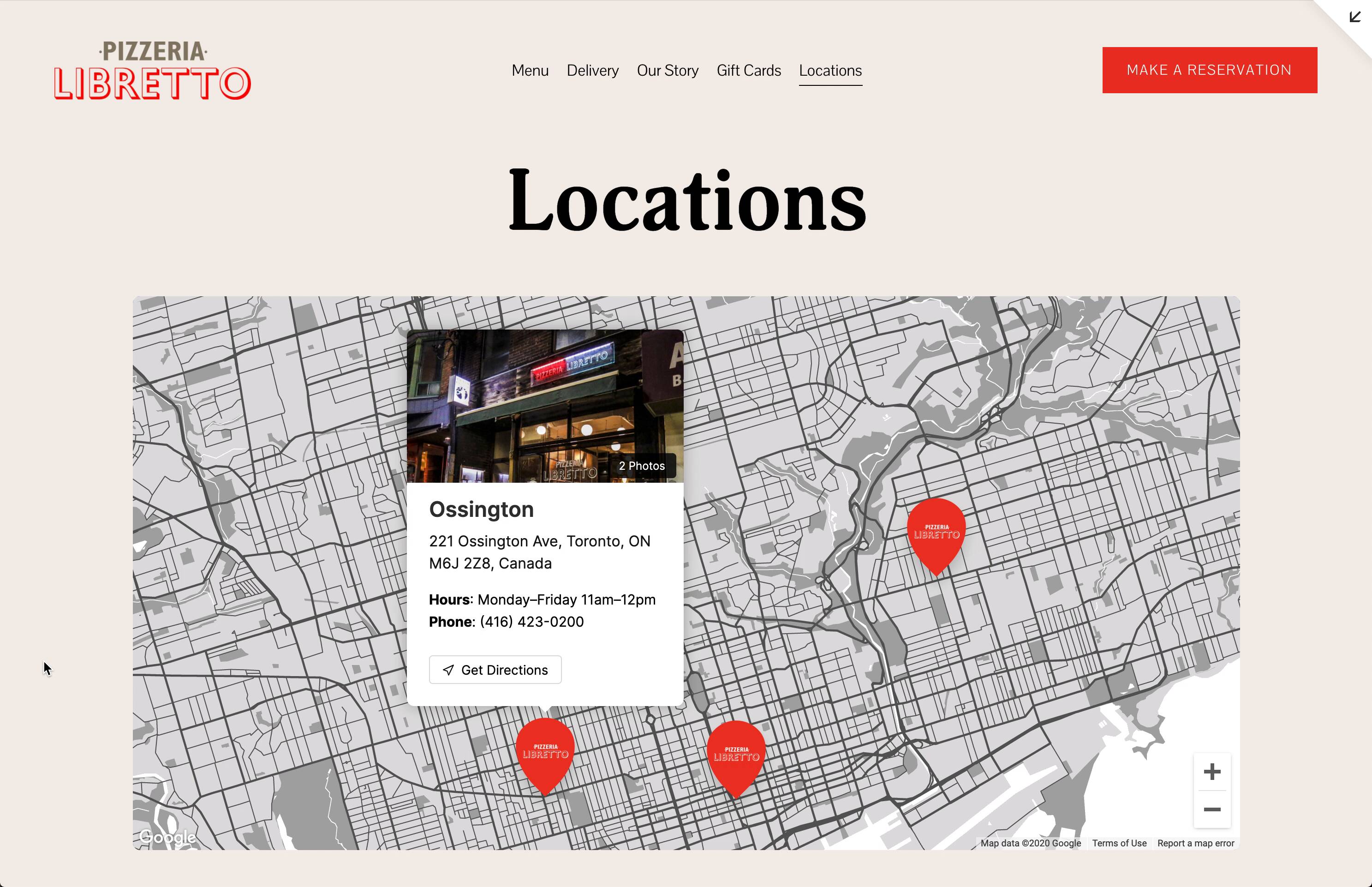 Reservations are important for Pizzeria Libretto so I made the cta really obvious with a big button in the navigation: